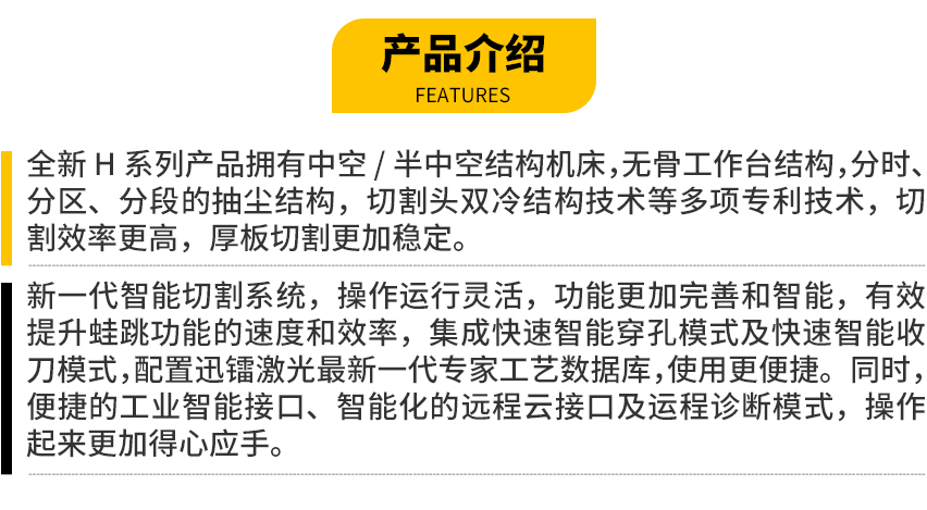 激光切割技術的逐漸普及,使其應用領域得到不斷拓展和加深。市場對超厚板穩(wěn)定加工、無煙無塵、高效切割以及服務質(zhì)量提出了更高的要求。迅鐳激光繼往開來、永續(xù)創(chuàng)新,始終位于“高功率與智能化”激光切割技術領域制高點。第8代激光切割裝備擁有10大核心優(yōu)勢,助力客戶降本增效,樹行業(yè)高端典范。