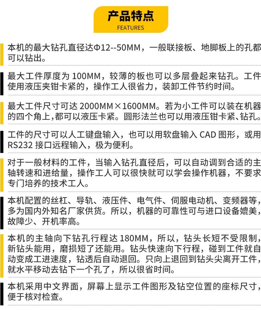 BT2016 型龍門移動式數控平面鉆床,用于在鋼板上鉆孔。加工的工件可以是鋼結構建筑、橋梁、鐵塔上的聯接板,也可以是大的法蘭盤、換熱器管板等。完全自動的加工。高效率、高精度。